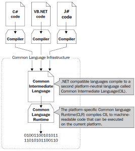 The following diagram shows that the languages are first compiled in CIL, after which the Common Language Runtime (CLR) compiles the platform-independent CIL code into machine readable code: