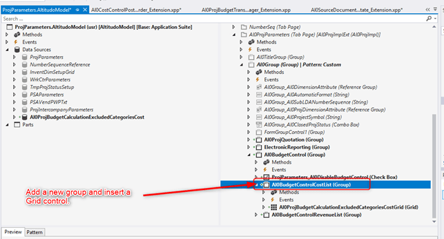 Create an extension of the “ProjParameters” Form and add a new datasource. The datasource points to the custom table “Al0ProjBudgetCalculationExcludedcategoriesCost”.