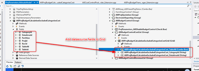 Add Data source of the grid control. In this case will be the custom table “Al0ProjBudgetCalculationExcludedCategoriesCost”