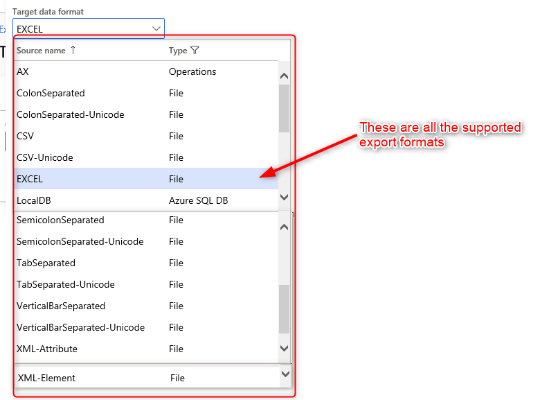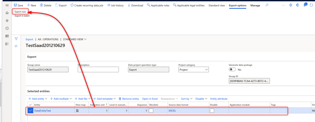 Click on “Add entity” and a dialog form will appear. Choose the entity to export and the outputt format (i.e. EXCEL, etc..)