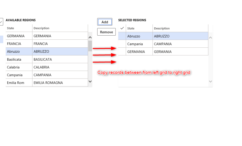 We want to copy records from a grid that contains all records of a table to another that contains same type of records but only the one we selected from the first one