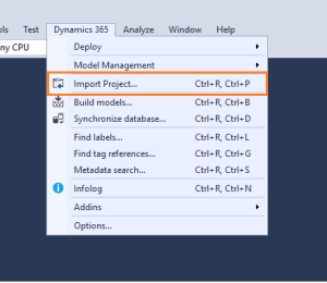 Go to Visual Studio and click on Dynamics 365 -> Import Project. Now select the .axpp file you need to import. By default all the elements in the project are selected for import. After selecting the elements click OK.