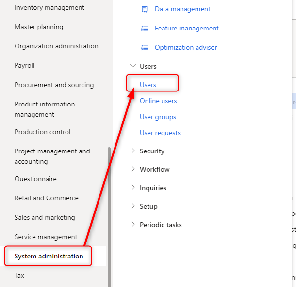 - Go to Navigation pane > Modules > System administration > Users > Users.