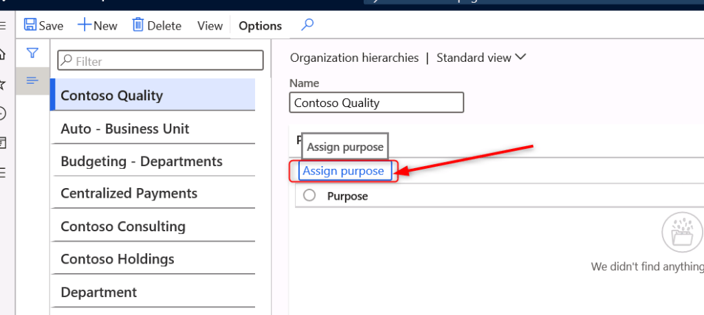 - Select Assign purpose. In the list at the left, find and select a purpose to assign to your organization hierarchy, such as ‘Expenditure internal control’.