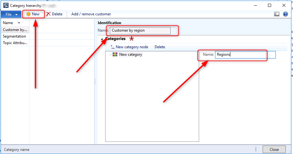 - In the Category hierarchy form, click New, and in the Name field, enter a name for the category hierarchy. For example, if you were creating a category hierarchy for regions in a geographical location, you might call it Customer by region.