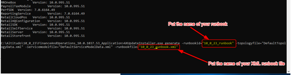 AXUpdateInstaller.exe generate -runbookid="10_0_23_runbook" -topologyfile="DefaultTopologyData.xml" -servicemodelfile="DefaultServiceModelData.xml" -runbookfile="10_0_23_runbook.xml"
