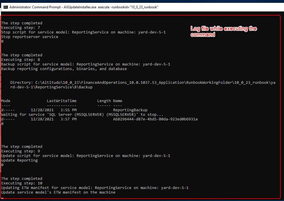 AXUpdateInstaller updates the runbook file after each step is run on a VM. The runbook also logs information about each step.