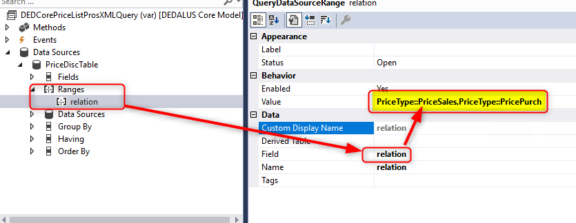The field to be filtered is “PriceDiscTable.Relation “ which is a base enum type
