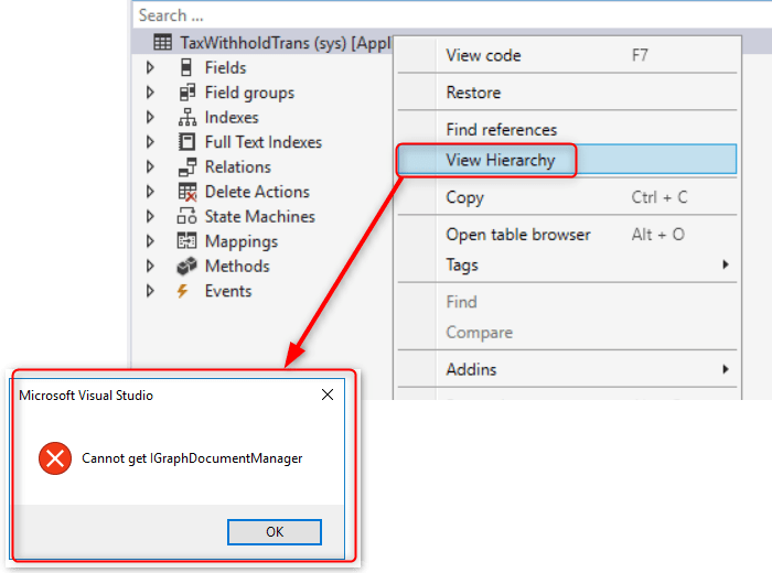 If you face this error when trying to view application object hierarchy it means you have to install an option Visual Studio component.