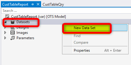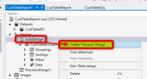 Drag and drop CustTableDS from the Datasets node to the Designs node.