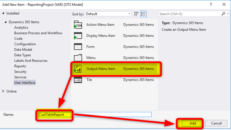 From the File menu, select New > Project. Select Dynamics 365 on the left pane. select Finance Operations in the middle pane. Enter ReportingProject in the Name field. Select OK.