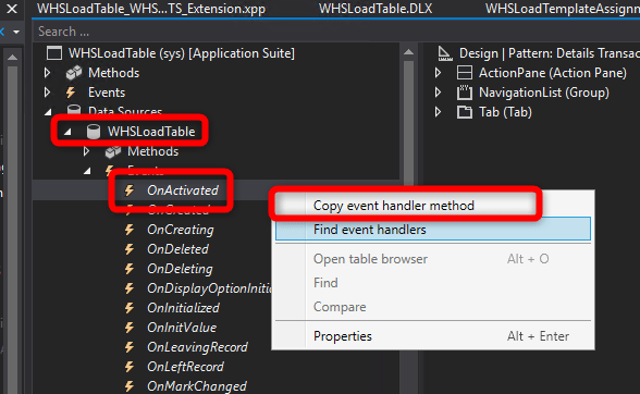 To hide it I can use event handlers so I enter the WHSLOADTABLE Form, open the datasource, click on “Events” and right-click on the “OnActivated” event. Then click on “Copy event handler method”