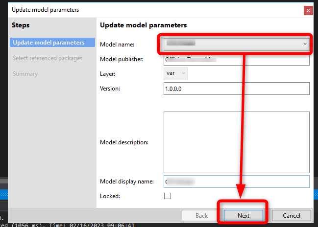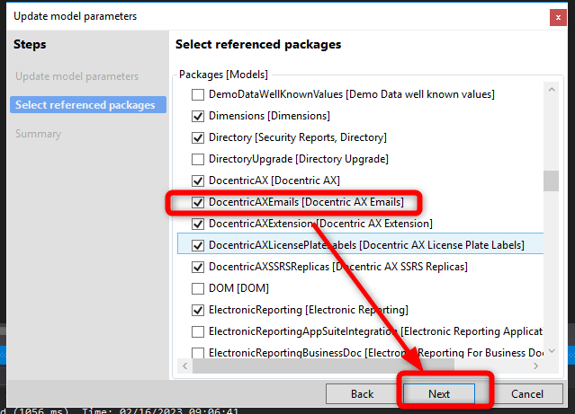 Choose the model you want to reference (in my case it’s Docentric AX Emails) and click Next