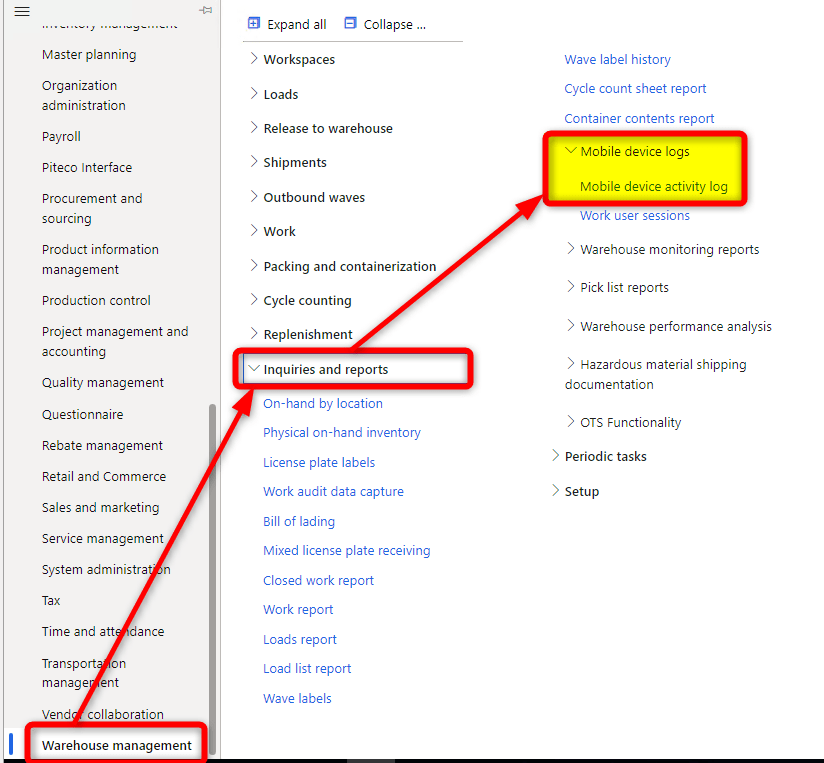 Go to : Warehouse management > Inquiries and reports > Mobile device logs > Work user sessions