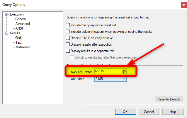 Default characters value is 65535 and data copied from result grid is only of length 65535